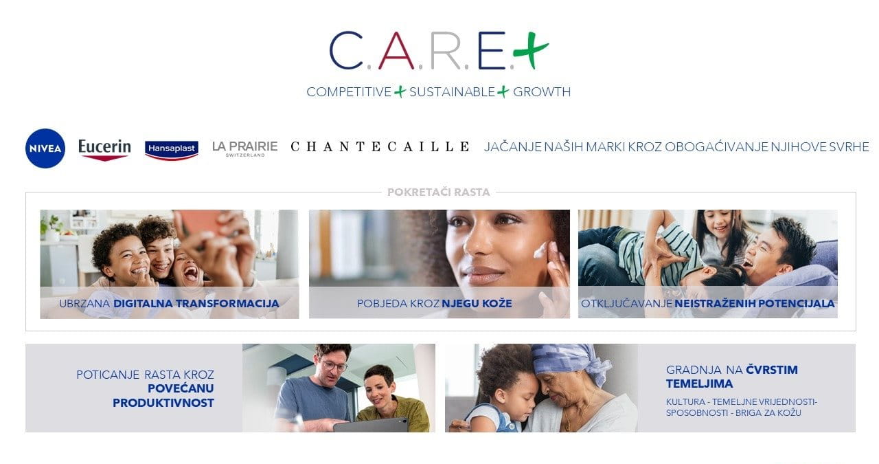 Beiersdorf je u mnogočemu iznimna tvrtka. Već gotovo 140 godina pomažemo ljudima da se osjećaju dobro u svojoj koži. CARE (njega) dio je naših temelja još od tada, a zajedno želimo oblikovati novu eru uspjeha. U vremenima povijesne disrupcije moramo odmah odlučno djelovati. Naša strategija C.A.R.E.+ naš je odgovor na to, a temelji se na jasnoj zadaći, pet strateških prioriteta + našoj ambiciji da stvaramo još više vrijednosti za ljude i društvo. C.A.R.E.+ postavlja njegu kao cilj kojem uvijek nastojimo težiti.
